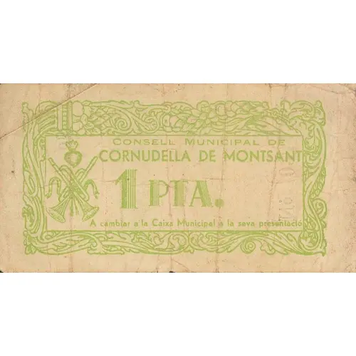 CONSELL MUNICIPAL DE CORNUDELLA DE MONTSANT 1 PTA. A cambiar a la Caixa Municipal a la seva presentació (Translation: Municipal Council of Cornudella de Montsant 1 Peseta To be changed at the `Caixa Municipal` in its presentation) |