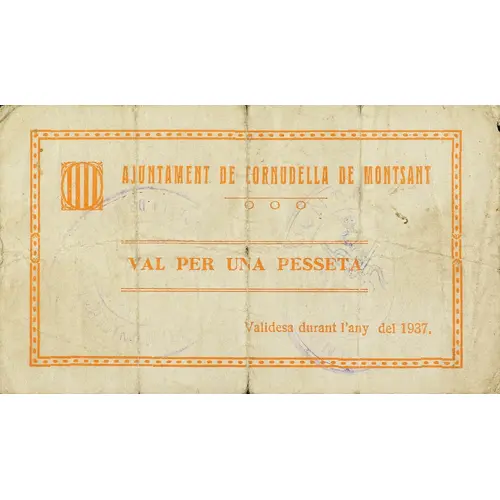 Obverse lettering AJUNTAMENT DE CORNUDELLA DE MONTSANT VAL PER UNA PESSETA Validesa durant l`any 1937.