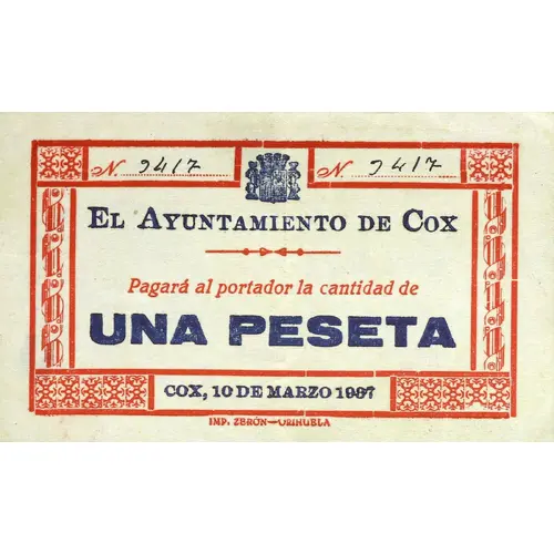 EL AYUNTAMIENTO DE COX Pagará al portador la cantidad de UNA PESETA COX, 10 DE MARZO 1937 (Translation: The City Council of Cox Will pay the bearer the amount of One Peseta Cox, March 10, 1937) |