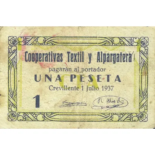 Cooperativas Textil y Alpargatera pagarán al portador UNA PESETA Crevillente 1 Julio 1937 1 (Translation: Textile and Espadrille Cooperatives will pay the bearer One Peseta Crevillente, July 1, 1937) |