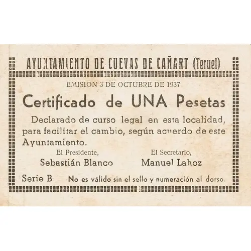AYUNTAMIENTO DE CUEVAS DE CAÑART (Teruel) EMISION 3 DE OCTUBRE DE 1937 Certificado de UNA Pesetas Declarado de curso legal en esta localidad, para facilitar el cambio, según acuerdo de este Consejo. No es válido sin el sello y numeración al dorso. (Translation: City Council of Cuevas de Cañart (Teruel) Issue October 3,1937 One Peseta certificate Declared legal tender in this locality, to facilitate the change, according to the agreement of this Council. Not valid without the stamp and numbering on the back.) |