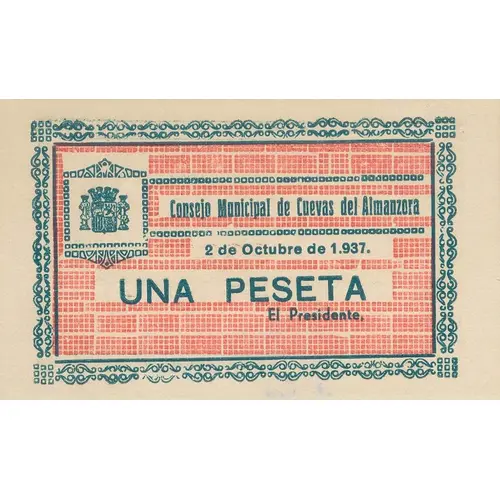 Consejo Municipal de Cuevas del Almanzora 2 de Octubre de 1.937. UNA PESETA (Translation: Municipal Council of Cuevas del Almanzora October 2, 1937. One Peseta) |
