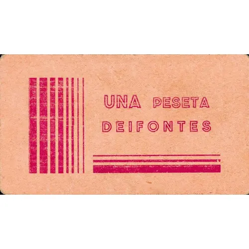 | Obverse lettering | UNA PESETA DEIFONTES (Translation: One Peseta deifontes) |