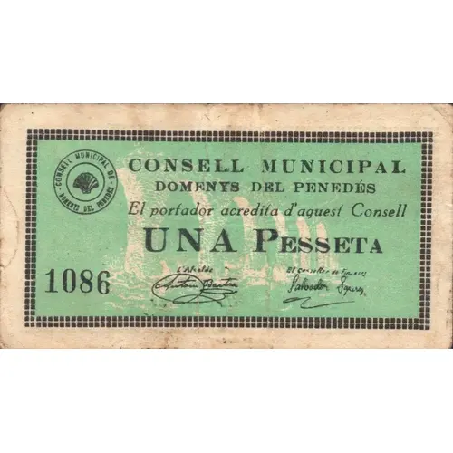 | Obverse lettering | CONSELL MUNICIPAL DOMENYS DEL PENEDÉS El portador acredita d`aquest Consell UNA PESSETA (Translation: Municipal Council of Domenys del Penedès The bearer accredits this Council One Peseta) |