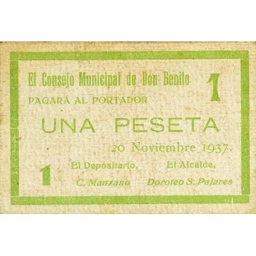 1 El Consejo Municipal de Don Benito PAGARÁ AL PORTADOR UNA PESETA 20 Noviembre 1937. (Translation: The Municipal Council of Don Benito Will pay the bearer One Peseta November 20, 1937.) |