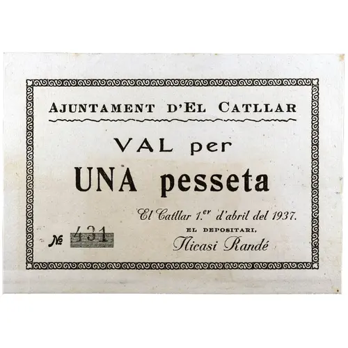 AJUNTAMENT D`EL CATLLAR VAL per UNA pesseta El Catllar 1.er d`Abril del 1937. (Translation: City Council of El Catllar Value for One Peseta El Catllar April 1, 1937.) |