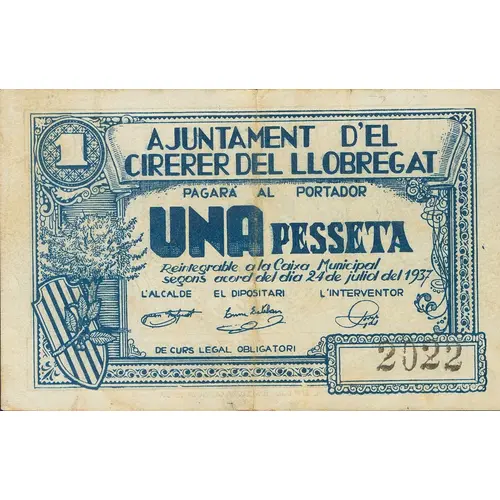 1 AJUNTAMENT D`EL CIRERER DEL LLOBREGAT PAGARÁ AL PORTADOR UNA PESSETA Reintegrable a la Caixa Municipal segons acord del dia 24 de juliol del 1937 DE CURS LEGAL OBLIGATORI (Translation: City Council of El Cirerer del Llobregat Will pay the bearer One Peseta Refundable to the `Caixa Municipal` according to the agreement of July 24, 1937 Of mandatory legal course) |
