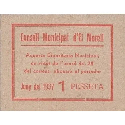 Consell Municipal d`El Morell Aquesta Dipositaria Municipal, en virtut de l`acord del 24 del corrent, abonarà al portador 1 PESSETA Juny del 1937 (Translation: Municipal Council of El Morell This Municipal Depository, by virtue of the agreement of the 24 of current, will pay to the bearer 1 Peseta June 1937) |