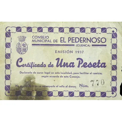 CONSEJO MUNICIPAL DE EL PEDERNOSO (CUENCA) EMISIÓN 1937 Certificado de Una Peseta Declarado de curso legal en esta localidad, para facilitar el cambio, según acuerdo de este Consejo. No es válido sin el sello al dorso. (Translation: Municipal Council of El Pedernoso (Cuenca) Issue 1937 One Peseta certificate Declared legal tender in this locality, to facilitate the change, according to the agreement of this Council. Not valid without the stamp on the back.) |