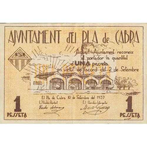 AJUNTAMENT d`EL PLA DE CABRA Aquest Ajuntament reconeix al portador la quantitat d`UNA pesseta en virtut d`acord del 2 de Setembre El Pla de Cabra 10 de Setembre del 1937 1 PESSETA (Translation: City Council of El Pla de Cabra This City Council recognizes to the bearer the amount of One Peseta according to agreement of September 2 El Pla de Cabra, September 10, 1937 1 Peseta) |