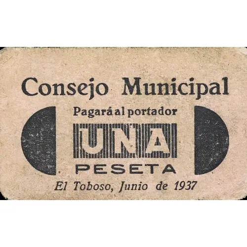 Consejo Municipal Pagará al portador UNA PESETA El Toboso, Junio de 1937 (Translation: Municipal Council Will pay the bearer One Peseta El Toboso, June 1937) |