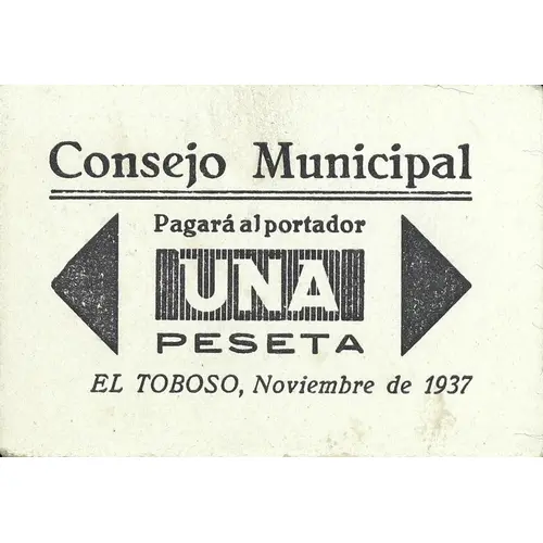 Consejo Municipal Pagará al portador UNA PESETA EL TOBOSO, Noviembre de 1937 (Translation: Municipal Council Will pay the bearer One Peseta El Toboso, November 1937) |