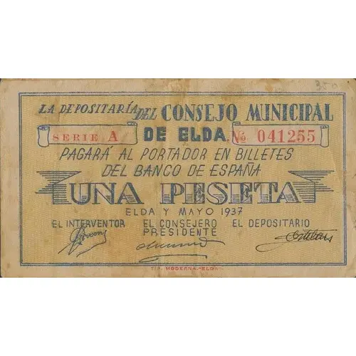 LA DEPOSITARÍA DEL CONSEJO MUNICIPAL DE ELDA PAGARÁ AL PORTADOR EN BILLETES DEL BANCO DE ESPAÑA UNA PESETA ELDA Y MAYO 1937 (Translation: The Depositary of the Municipal Council of Elda Will pay the bearer in banknotes of the Bank of Spain One Peseta Elda and May, 1937) |