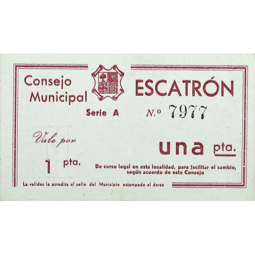 | Legenda del dritto | Consejo Municipal ESCATRÓN Vale por 1 pta. una pta. De curso legal en esta localidad, para facilitar el cambio, según acuerdo de este Consejo La validez la acredita el sello del Municipio estampado al dorso (Translation: Municipal Council Escatron Voucher for 1 Peseta One Peseta Legal tender in this locality, to facilitate the exchange, according to the agreement of this Council Validity is confirmed by the stamp of the Municipality stamped on the back) |