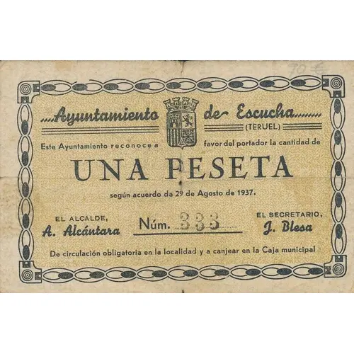 Ayuntamiento de Escucha (TERUEL) Este Ayuntamiento reconoce a favor del portador la cantidad de UNA PESETA según acuerdo de 29 de Agosto de 1937. De circulación obligatoria en la localidad y a canjear en la Caja municipal (Translation: City Council of Escucha (Teruel) This City Council recognizes in favor of the bearer the amount of One Peseta according to the agreement of August 29, 1937. Mandatory circulation in the town and to be exchanged at the Municipal Fund) |