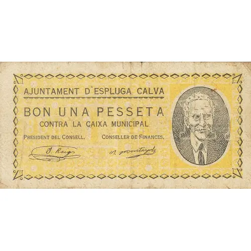 BON 1 PESSETA EMISSIO 1er OCTUBRE DEL 1937 AJUNTAMENT D`ESPLUGA CALVA (Translation: Bond 1 Peseta Issue October 1, 1937 City Council of Espluga Calva) |