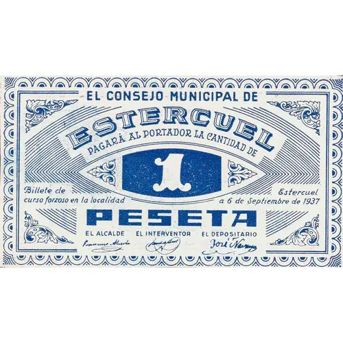 EL CONSEJO MUNICIPAL DE ESTERCUEL PAGARÁ AL PORTADOR LA CANTIDAD DE 1 PESETA Billete de curso forzoso en la localidad Estercuel a 6 de Septiembre de 1937 (Translation: The Municipal Council of Estercuel Will pay the bearer the amount of 1 Peseta Mandatory course banknote in the municipality Estercuel, September 6, 1937) |