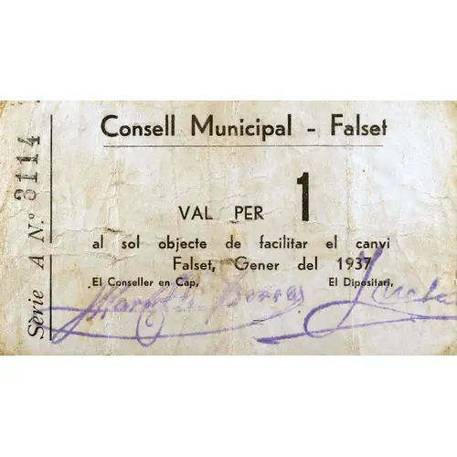 Consell Municipal - Falset VAL PER 1 al sol objecte de facilitar el canvi Falset, Gener del 1937 (Translation: Municipal Council - Falset Voucher for 1 with the sole purpose of facilitating change Falset, January 1937) |