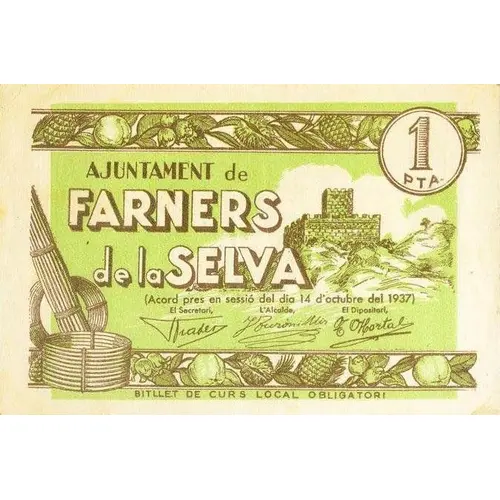 1 PTA. AJUNTAMENT de FARNERS de la SELVA (Acord pres en sessió del dia 14 d`octubre del 1937) BITTLET DE CIRS LOCAL OBLIGATORI (Translation: 1 Peseta City Council of Farners de la Selva (Agreement reached in session on October 14, 1937) Mandatory local course banknote) |
