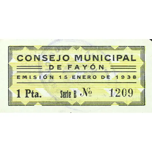 | Obverse lettering | CONSEJO MUNICIPAL DE FAYÓN EMISIÓN 15 ENERO DE 1938 1 Pta. (Translation: Municipal Council of Fayón Issue January 15, 1938 1 Peseta) |