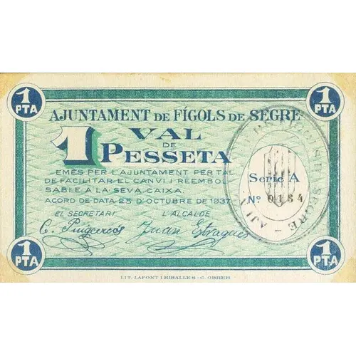| Obverse lettering | 1 PTA AJUNTAMENT DE FÍGOLS DE SEGRE VAL DE 1 PESSETA EMÈS PER L`AJUNTAMENT PER TAL DE FACILITAR EL CANVI I REEMBOLSABLE A LA SEVA CAIXA. ACORD DE DATA 25 D`ACTUBRE DE 1937 (Translation: 1 Peseta City Council of Fígols de Segre Voucher of 1 Peseta Issued by the City Council in order to facilitate the change and refundable to its `Caixa`. Agreement dated October 25, 1937) |