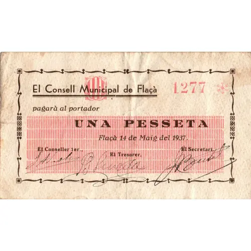 El Consell Municipal de Flaçà pagarà al portador UNA PESSETA Flaçà 14 de Maig del 1937. (Translation: The Municipal Council of Flaçà will pay the bearer One Peseta Flaçà, May 14, 1937) |