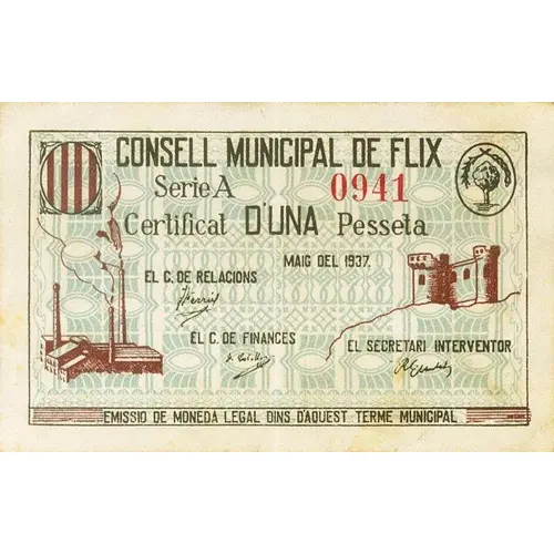 CONSELL MUNICIPAL DE FLIX Cetificat de D`UNA Pesseta MAIG DEL 1937 EMISSIO DE MONEDA LEGAL DINS D`AQUEST TERME MUNICIPAL (Translation: Municipal Council of Flix Certificate of One Peseta May 1937 Issuance of legal tender within this municipality) |