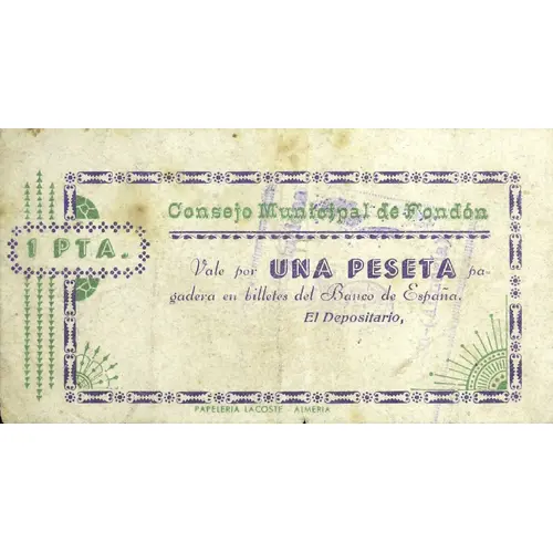 Consejo Municipal de Fondón 1 PTA. Vale por UNA PESETA pagadera en billetes del Banco de España. PAPELERIA LACOSTE - ALMERIA (Translation: Municipal Council of Fondón 1 Peseta It is worth One Peseta payable in Bank of Spain notes.) |