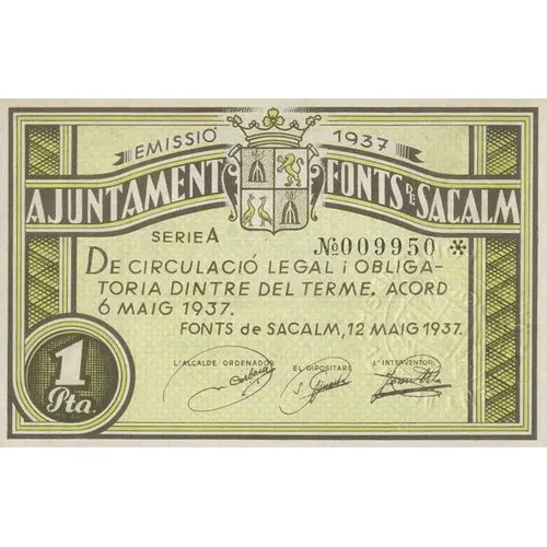 EMISSIÓ 1937 AJUNTAMENT FONTS DE SACALM DE CIRCULACIÓ LEGAL I OBLIGATÒRIA DINTRE DEL TERME. ACORD 6 MAIG 1937 FONTS de SACALM, 12 MAIG 1937 1 Pta. (Translation: Issue 1937 City Council of Fonts de Sacalm Of legal and mandatory circulation within the term. Agreement of May 6, 1937 Fonts de Sacalm, May 12, 1937 1 Peseta) |