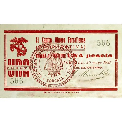 UNA PESETA El Centro Obrero Forcallense (COOPERATIVA) PAGARÁ AL PORTADOR UNA peseta FORCALL, 20 Mayo 1937. (Translation: One Peseta The Forcallense Workers Center (Cooperative) Will pay the bearer One Peseta Forcall, May 20, 1937.) |