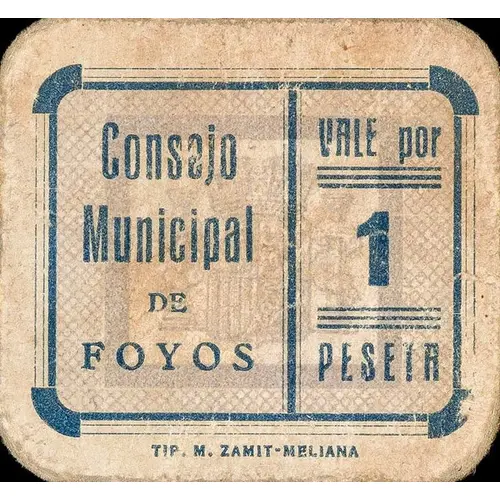 Consejo Municipal DE FOYOS VALE por 1 PESETA TIP. M. ZAMIT - MELIANA (Translation: Municipal Council of Foyos Voucher for 1 Peseta) |