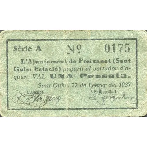 L`Ajuntament de Freixanet (Sant Guim Estació) pagarà al portador d`aquest VAL UNA Pesseta. Sant Guim, 22 de Febrer del 1937. (Translation: The City Council of Freixanet (Sant Guim Estació) will pay the bearer of this Voucher One Peseta. Sant Guim, February 22, 1937.) |