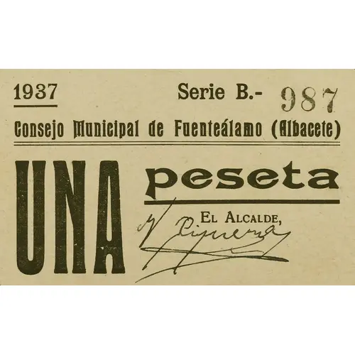 1937 Consejo Municipal de Fuenteálamo (Albacete) UNA peseta (Translation: Municipal Council of Fuenteálamo (Albacete) One Peseta) |