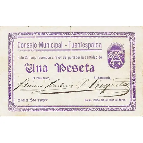 Consejo Municipal - Fuentespalda Este Consejo reconoce a favor del portador la cantidad de Una Peseta EMISIÓN 1937 No es válido sin el sello al dorso. (Translation: Municipal Council - Fuentespalda This Council recognizes in favor of the bearer the amount of One Peseta Issue 1937 Not valid without stamp on back.) |