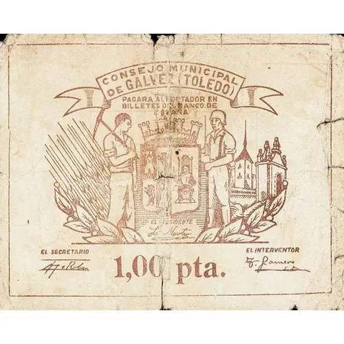 (Translation: Municipal Council of Galvez (Toledo) Will pay the bearer in banknotes of the Bank of Spain 1.00 Peseta)