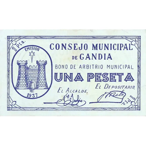 Obverse lettering EMISION 1937 CONSEJO MUNICIPAL DE GANDIA BONO DE ARBITRIO MUNICIPAL UNA PESETA