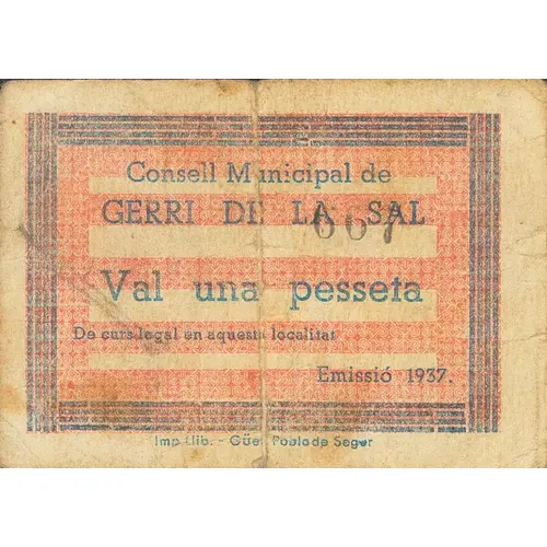 Consell Municipal de GERRI DE LA SAL Val una pesseta De curs legal en aquesta localitat Emissió 1937. (Translation: Municipal Council of Gerri de la Sal Value One Peseta Of legal course in this location Issue 1937.) |