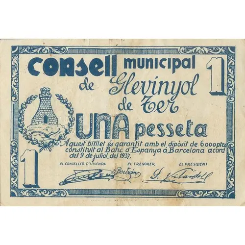 (Translation: Municipal Council of Glevinyol de Ter One Peseta This banknote is guaranteed by the deposit of 6,000 Pesetas set up at the Bank of Spain in Barcelona on July 9, 1937.)