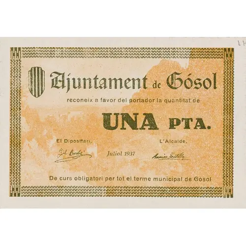 (Translation: City Council of Gósol recognizes in favor of the bearer the amount of One Peseta July 1937 Mandatory course throughout the municipality of Gósol)