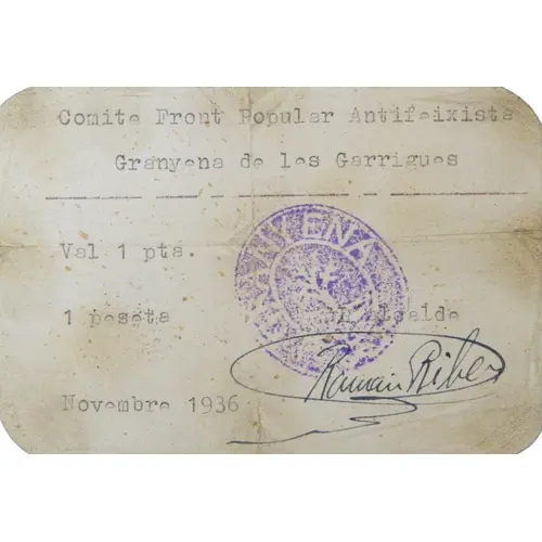 (Translation: Antifascist Popular Front Committee Granyena de les Garrigues Valid for 1 Peseta 1 Peseta November 1936)