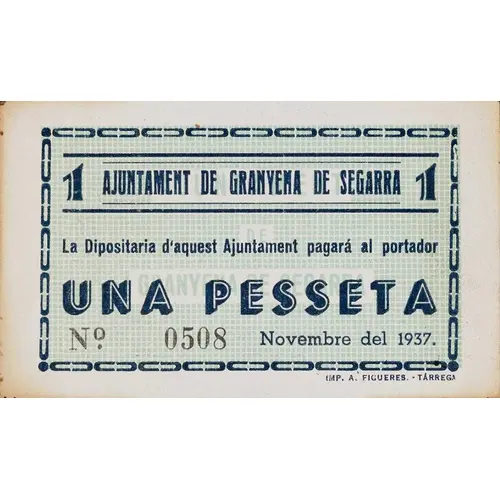 1 AJUNTAMENT DE GRANYENA DE SEGARRA La Dipositaria d`aquest Ajuntament pagará al portador UNA PESSETA Novembre del 1937. (Translation: City Council of Granyena de Segarra The Depository of this City Council will pay the bearer One Peseta November 1937.) |