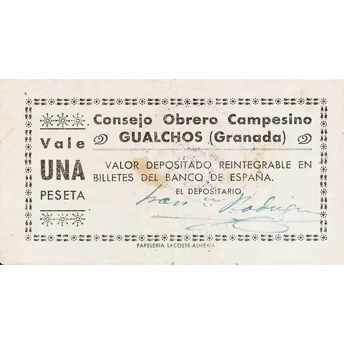 | Obverse lettering | Vale UNA PESETA Consejo Obrero Campesino GUALCHOS (Granada) VALOR DEPOSITADO REINTEGRABLE EN BILLETES DEL BANCO DE ESPAÑA. (Translation: It`s worth One Peseta Peasant Workers Council Gualchos (Granada) Deposited value refundable in banknotes of the Bank of Spain.) |