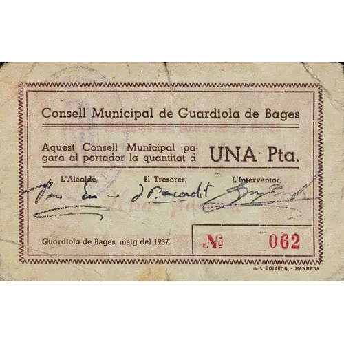 | Obverse lettering | Consell Municipal de Guardiola de Bages Aquest Consell Municipal pagarà al portador la quantitat d` UNA Pta. Guardiola de Bages, maig del 1937. IMP. BOIXEDA - MANRESA (Translation: Municipal Council of Guardiola de Bages This Municipal Council will pay the bearer the amount of One Peseta Guardiola de Bages, May 1937.) |