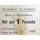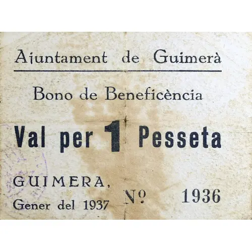 Ajuntament de Guimerà Bono de Beneficència Val per 1 Pesseta GUIMERA, Gener del 1937 (Translation: City Council of Guimerà Charity Bonus Voucher for One Peseta January 1937) |