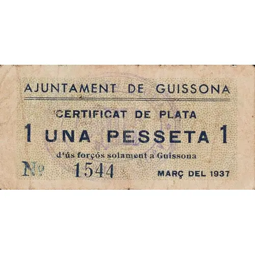 | Obverse lettering | AJUNTAMENT DE GUISSONA CERTIFICAT DE PLATA 1 UNA PESSETA 1 d`ús forçós solament a Guissona MARÇ DEL 1937 (Translation: City Council of Guissona Silver Certificate One Peseta mandatory use only in Guissona March 1937) |
