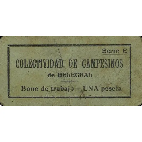 | Obverse lettering | COLECTIVIDAD DE CAMPESINOS de HELECHAL Bono de trabajo - UNA peseta (Translation: Peasants Collectivity of Helechal Work Bond - One Peseta) |