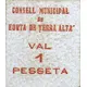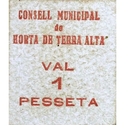 | Obverse lettering | CONSELL MUNICIPAL de HORTA DE TERRA ALTA VAL 1 PESSETA (Translation: Municipal Council of Horta de Terra Alta Voucher 1 Peseta) |