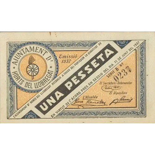 | Obverse lettering | AJUNTAMENT D`HORTS DEL LLOBREGAT Emissió 1937 L`AJUNTAMENT D`HORTS DEL LLOBREGAT RECONEIX A FAVOR DEL PORTADOR LA QUANTITAT DE UNA PESSETA EN VIRTUT DE L`ACORD PRES EN SESSIÓ DEL DIA 11 DE JUNY DEL 1937 (Translation: City Council of Horts del Llobregat Issue 1937 The City Council of Horts del Llobregat recognizes in favor of the bearer the amount of One Peseta Pursuant to the agreement reached in session on June 11, 1937) |