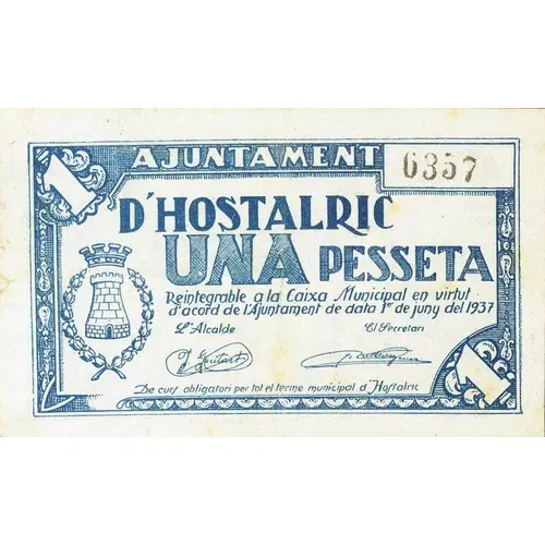 1 AJUNTAMENT D`HOSTALRIC UNA PESSETA Reintegrable a la Caixa Municipal en virtut d`acord de l`Ajuntament de data 1er de juny del 1937 De curs obligatori per tot el terme municipal d`Hostalric (Translation: City Council of Hostalric One Peseta Refundable to the `Caixa Municipal` under an agreement of the City Council dated June 1, 1937 Mandatory course throughout the municipality of Hostalric) |