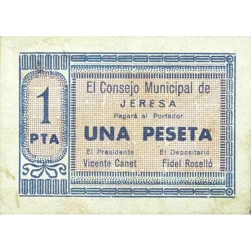 1 PTA. El Consejo Municipal de JERESA Pagará al portador UNA PESETA (Translation: 1 Peseta The Municipal Council of Jeresa Will pay the bearer One Peseta) |